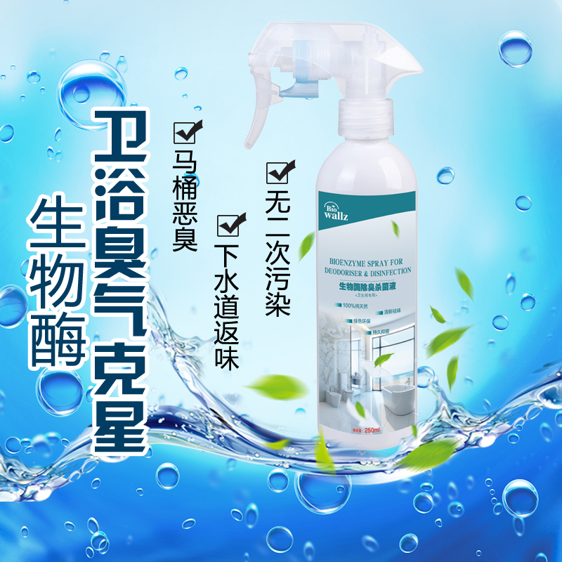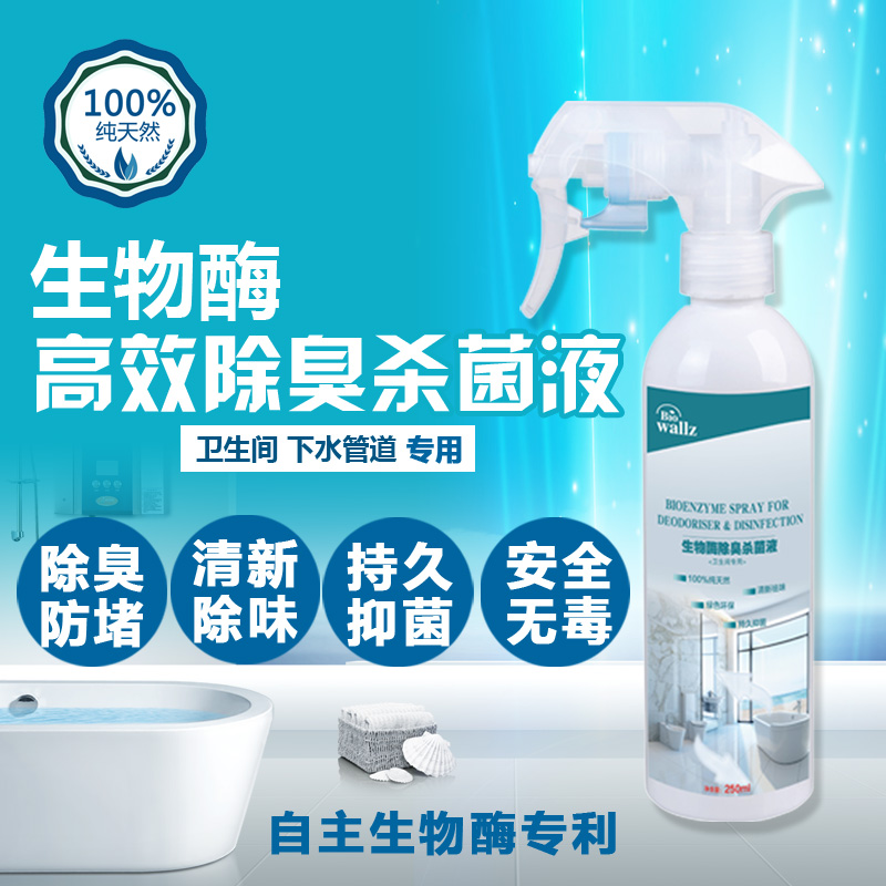 wallz 衛生間除臭菌液,利用專用生物酶及植物提取液降解尿氨、分解氨氣、硫化氫、甲硫醇、甲硫醚等惡臭物質,生成無毒無味的分子,能夠廣譜殺滅細菌、病毒、霉菌、真菌等各種頑固細菌,并抑制腐敗病原微生物生長。本產品只含有純天然生物活性物質,高效殺菌,持久祛味,母嬰安全,綠色環保,提高衛生間居室環境空氣質量,起到殺菌除臭和阻止管道阻塞的功效,是您家居健康的最佳選擇。